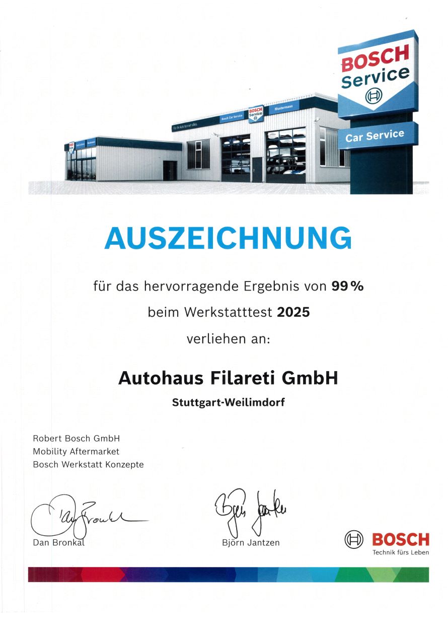 Wir bieten im Autohaus Filareti den Bosch Car Service an. Profitieren Sie von unserem speziellen Bosch Service wie z. B. Inspektion, Reparatur, Reifen- oder Glasservice.